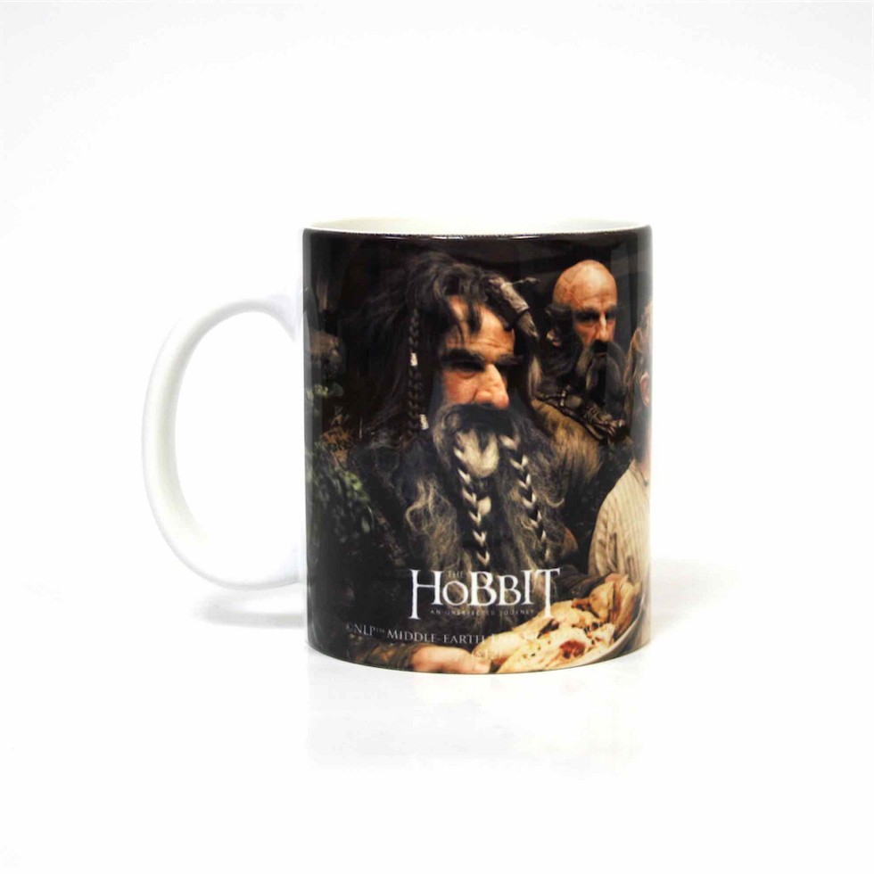 Taza de cerámica con imagen de la cena inesperada que ocurre en casa de Bilbo, como aparece en la película "El Hobbit". Para fans tanto del film como de la obra de Tolkien. Se presenta en caja con ventana.