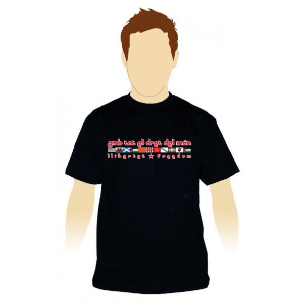 Samarreta de cotó de qualitat de color negre o verd bosc, de temàtica internacionalista amb l'estampat "Amb tot el dret del món" "Llibertat - Freedom" amb les banderes de diverses nacions sense estat d'arreu del món, que estan en procès d'autodeteminació.