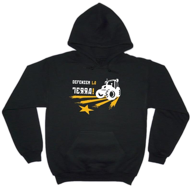 Dessuadora amb caputxa i butxaca davantera "Defensem la terra"Imprès al pit un missatge clar i sempre vigent "Defensem la Terra!", un antic i bell crit de guerra, que acompanya un tractor que lleura la Terra per a fer-la més lliure.