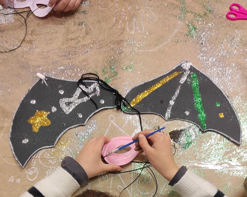 Un cop fetes les ales, mentre s’assecava tot, per no malgastar cola ni purpurina, hem decorat uns antifaços. Primer hem posat la cola, i llavors la purpurina, igual que amb les ales cadascú ha deixat volar la seva imaginació, han quedat uns antifaços ben originals!