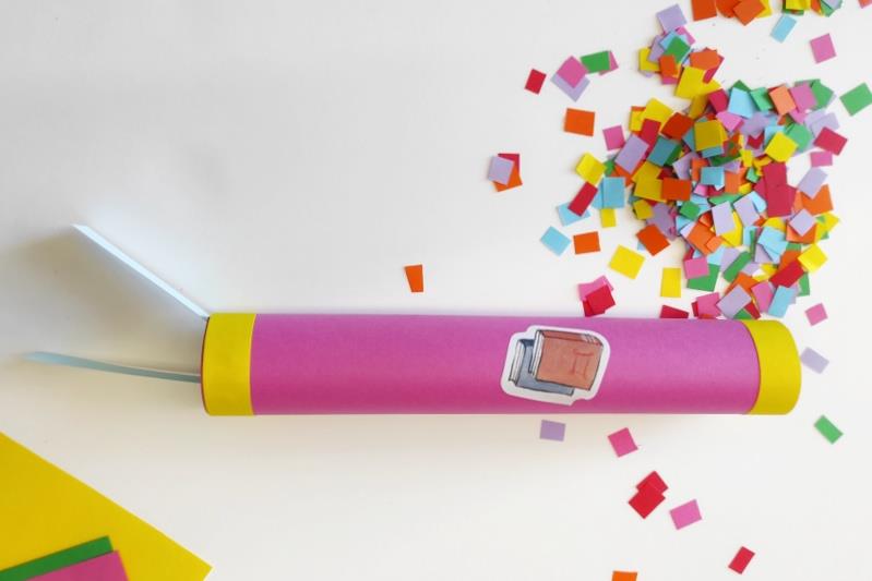Ara toquen els últims detalls. Retallem una tira d’1 cm i mig de la cartolina que no hem utilitzat (també podem aprofitar algun tros que tingueu sobrant d’altres manualitats), dobleguem la tira per la meitat i ho pengem d’una goma. Això ens servirà per disparar el kabuki. Amb 2 tires de paper de color diferent, decorem la part de dalt i de baix del kabuki. Al mig hi posem un adhesiu o enganxem un dibuix del que més ens agradi. Ja només queda omplir-lo, per fer-ho agafem papers de colors diferents i els retallem a quadradets petits. Un cop tallats omplim el kabuki per la part de dalt, i… QUE COMENCI LA FESTA!!!!