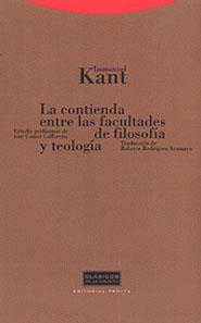 La contienda entre las Facultades de Filosofía y Teología tiene su génesis en el enfrentamiento de Kant con la censura prusiana. Acicateado por los problemas que le planteó algún ministro del sucesor de su admirado Federico el Grande, el filósofo de Königsberg decide reivindicar el papel de la filosofía como depositaria de los auténticos intereses de la razón, del puro afán de saber, situándola en el ala izquierda del parlamento universitario. Su misión es velar por la búsqueda de la verdad y por ello debe verse a salvo de cualquier injerencia por parte del poder político. Es al calor de semejante reivindicación como se acrisolan los planteamientos kantianos en torno a su concepción de la teología y la filosofía de la religión. Por otra parte, cabe destacar el hecho de que la estructura del texto, tal y como es presentado en esta edición, se muestra totalmente respetuosa con el esquema proyectado por su autor.
