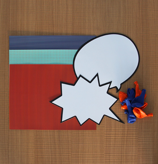 El deco kit Héroes es la media naranja del mini kit Héroes.Con un look muy de cómic, es el kit más infantil que hemos creado.Deja salir al héroe que llevas dentro!8 individuales ilustrados10 globos de colores5 bocadillos de dos formas (40 x 20 cm)