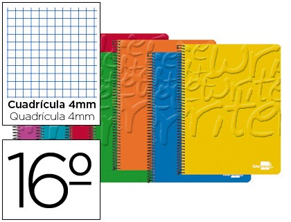 Tapa de cartoncillo de 400 g/m² impresa y plastificada en polietileno brillo. Contratapa de cartoncillo de 400 g/m². 80 hojas. Papel de 60 g/m². Espiral nylonizada blanca. Sin margen. Cuadrícula de 4 mm. Colores surtidos.