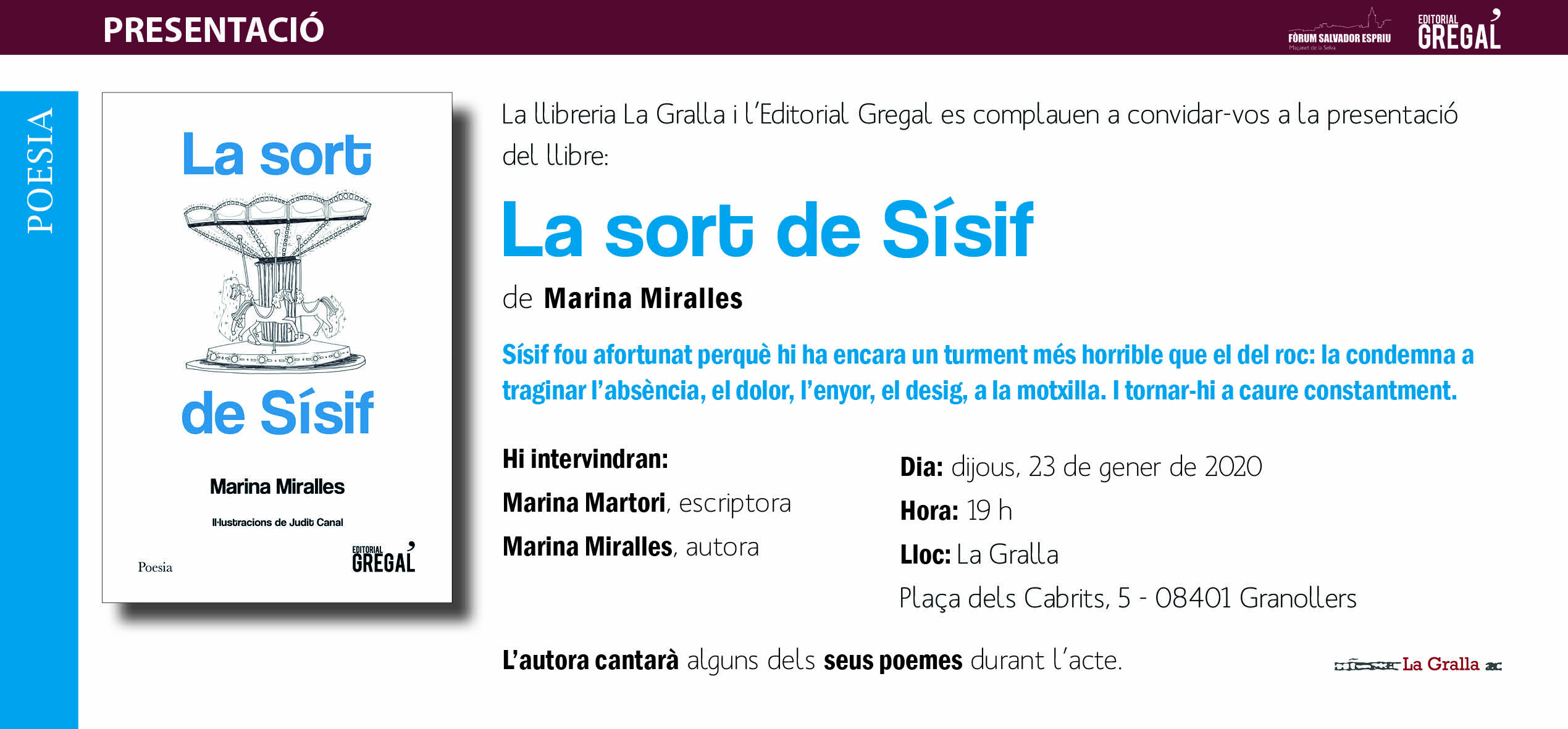 El roc, sabeu?, la pedra enorme que Sísif ha de carregar fins al cim d’una muntanya, però que quan arriba a dalt torna a caure i ell l’ha de tornar a buscar i carregar-la de nou, i vinga, amunt, que no ha estat res… Doncs no és res, aquest roc, no és res, aquest turment, al costat d’un altre. Hi ha una pedra que pesa més i que fa de més mal carregar, una pedra més grossa i més punyent que costa més d’arrossegar, que costa tant que Sísif es pot considerar afortunat. Que Sísif té sort, molta sort, de no haver de traginar l’absència d’algú que encara hi és.