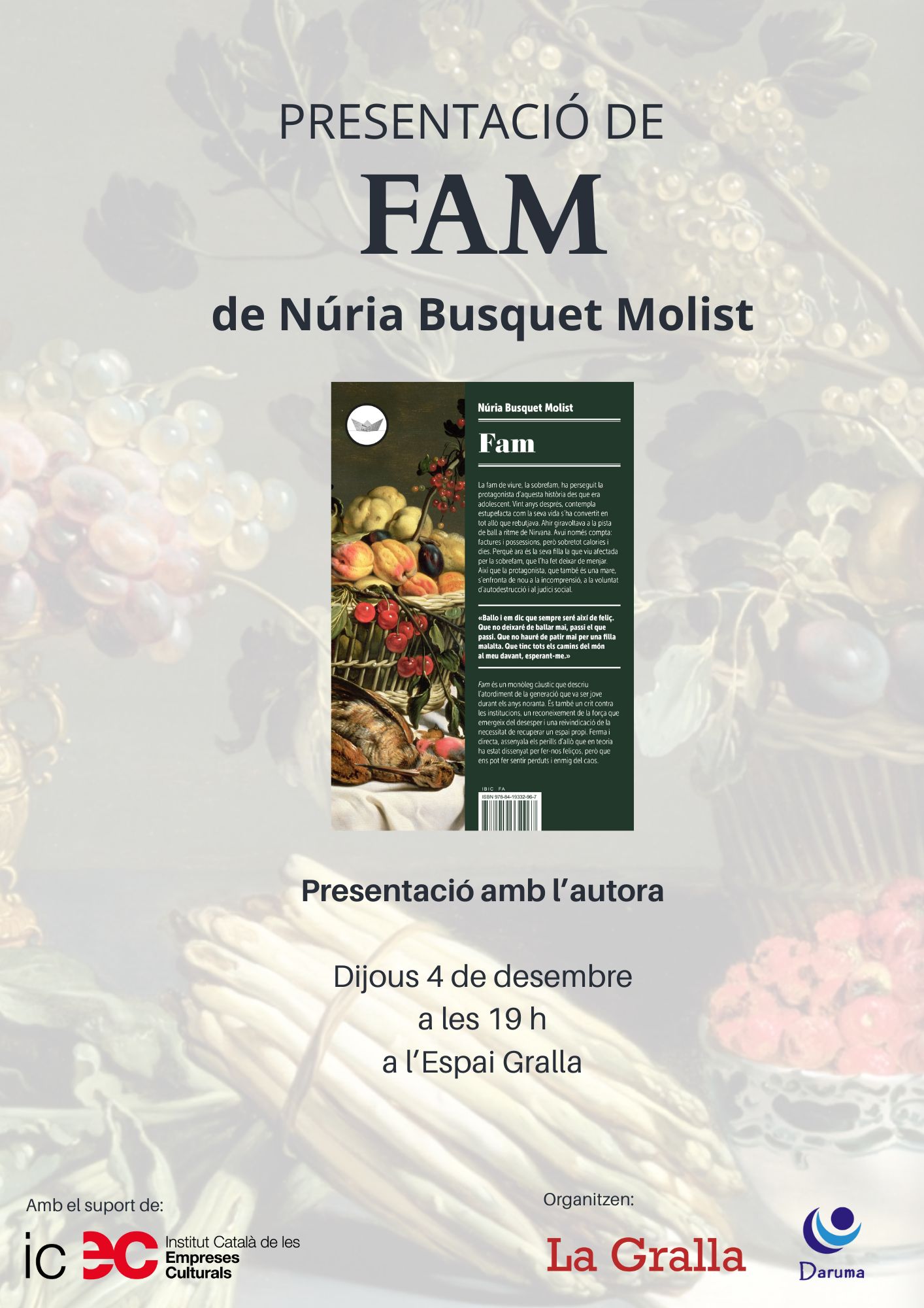 "Fam és un monòleg càustic que descriu l’atordiment de la generació que va ser jove durant els anys noranta. És també un crit contra les institucions, un reconeixement de la força que emergeix del desesper i una reivindicació de la necessitat de recuperar un espai propi. Ferma i directa, assenyala els perills d’allò que en teoria ha estat dissenyat per fer-nos feliços, però que ens pot fer sentir perduts i enmig del caos".