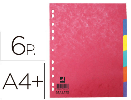 Separador q-connect cartulina brillo juego de 6 separadores din a4+ multitaladro.Juego de separadores fabricado en cartulina brillo de color de 225 g/m². Disposición en escalera para agilizar la consulta e identificación de documentos. Multitaladro para archivar en diferentes mecanismos de anillas. ...