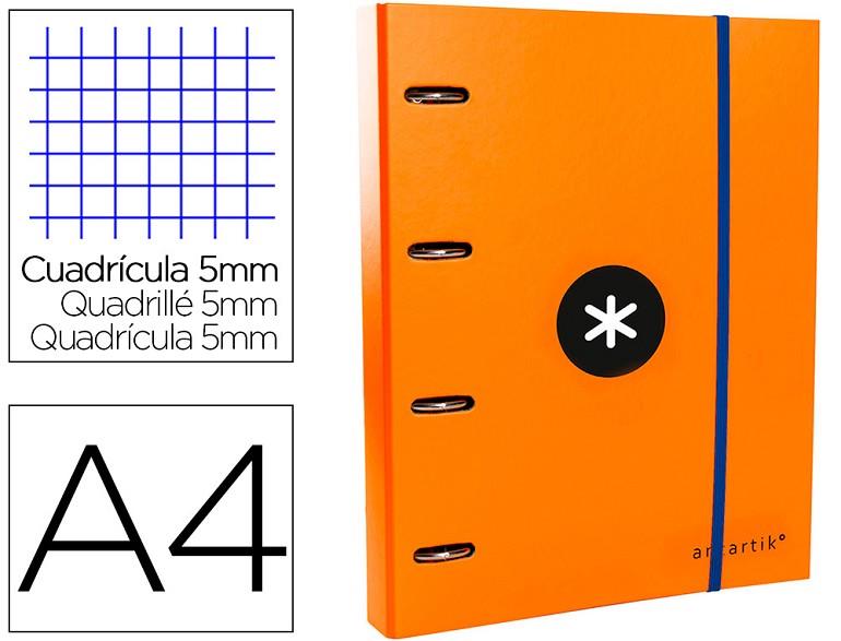 Carpeta con recambio y solapa liderpapel antartik a4 cuadro 5 mm forrada 4 anillas redondas 40mm color naranja.Tapa de cartón forrado de 1,75 mm de espesor. 4 anillas redondas. Cierre de gomilla. Con ranuras para anillas. 100 hojas con 5 bandas de color. Papel interior extrablanco de 100 g/m². Ultra...