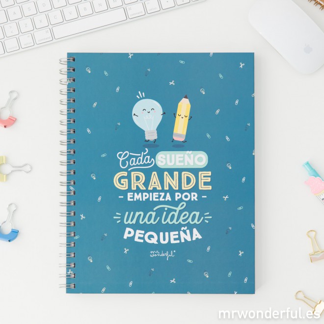 A veces, te despiertas en mitad de la noche con una superidea y te tienes que levantar a apuntarla, porque es tan genial, estupenda y brillante que si te descuidas… se te olvida. Así que para que ninguna idea, por pequeña que sea, se te escape, escríbela en esta libreta tan bonita. Porque los sueños grandes casi siempre nacen de ideas pequeñas.