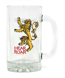 Oye mi Rugido. Jarra de Cerveza en Cristal con el lema de la casa Lannister de la serie de TV Juego de Tronos. Juego de Tronos es una de la series más exitosa del momento y narra las violentas luchas entre varias familias nobles por gobernar los Siete Reinos.