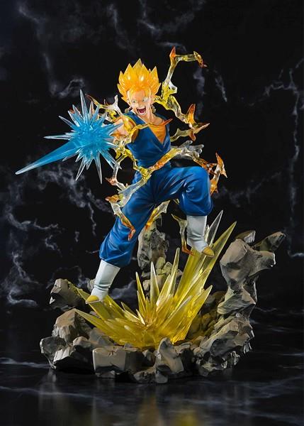 Tamashii Nations presenta esta espectacular figura, exclusiva de su web, de Vegetto Super Saiyan para la colección Figuarts Zero. Se trata de una figura de PVC de unos 14,5 cm de alto. Está diseñada para mostrarla junto a la figura de Gogeta (se vende por separado) para recrear escenas de batalla. Incluye un soporte de exposición especial.