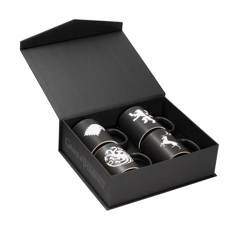 SD Toys lanza a la venta este set de cuatro tazas con los emblemas de las casas más icónocas de la serie "Game of Thrones", en blanco y negro. La base de las tazas es de un elegante color negro mate y los diseños de las mismas están grabados a láser (bajo relieve). Se presentan en una caja de lujo con cierre magnético, protegida por una banda impresa con áreas destacadas en brillo. Se trata de una edición limitada a 4000 sets en todo el mundo, que incluye una tarjeta numerada a mano.