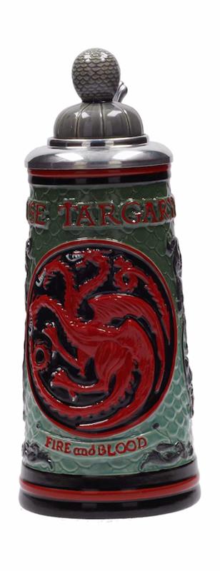 ¿Quién se hará finalmente con el trono de hierro? El que lo consiga, bien pudiera celebrarlo con una buena cerveza en estas jarras de cerámica con relieve, de estilo alemán. Cada una de ellas está dedicada a una de las principales casas y está decorada con motivos que representan a la familia en cuestión, incluida la tapa con un elemento distintivo en 3D.Se presentan en caja ilustrada a todo color.