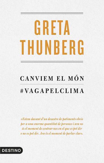 Quan la Greta Thunberg va prendre consciència del desastre que suposarà per a la humanitat el canvi climàtic, va decidir començar a lluitar per aturar-lo. L’agost del 2018 va iniciar una vaga escolar que ara com ara ja segueixen centenars de milers d’estudiants a tot el món. Des de llavors ha aconseguit cridar l’atenció mediàtica i parlar davant dels líders mundials amb un missatge molt clar: els adults han d’actuar, perquè quan els joves d’avui siguin grans ja no hi haurà marxa enrere. La Greta, que té un trastorn d’Asperger, és candidata al Premi Nobel de la Pau. Aquest volum és un recull de tots els seus discursos.
