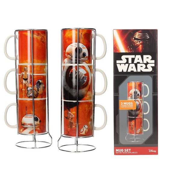 Set de tres tazas de cerámica apilables, con un espectacular diseño basado en la nueva entrega de la saga "Star Wars" ("The Force Awakens").