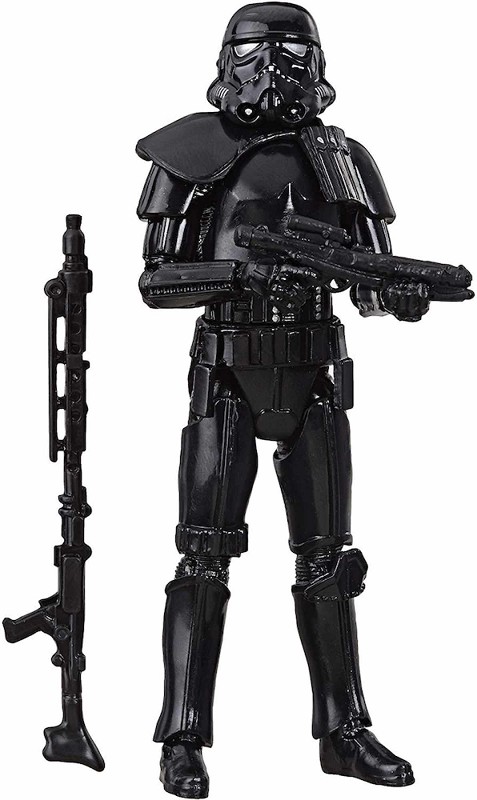 Hasbro presenta dentro de su colección Star Wars Vintage la figura del Shadow Tropper tal y como aparece en el spin-off de la saga Star Wars "Rogue One". La figura es articulada y está hecha en PVC y mide unos 10 cm. Incluye rifle blaaster y carabina blaster como complemento.