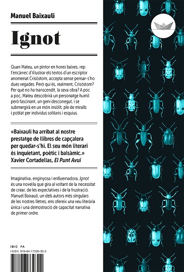 Imaginativa, enginyosa i enlluernadora, Ignot és una novel·la que gira al voltant de la necessitat de crear, de les expectatives i de la frustració. Manuel Baixauli, un dels autors més singulars de les nostres lletres, ens ofereix una veu literària única i una demostració de capacitat narrativa de primer ordre.