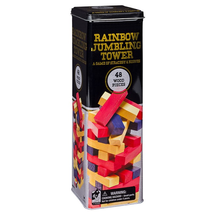 Fantástico juego que combina habilidad, amigos, risas y suerte. Fácil de jugar y muy divertido. Primero apilad los bloques de colores para construir una torre. Los jugadores se turnan para hacer rodar el dado y quitar una pieza bien de la parte inferior o del medio con una sola mano. Tómate tu tiempo y elige bien. Ganas si eres el último jugador en retirar un bloque sin que se derrumbe la torre. ¡Trata de mantener tu mano estable!