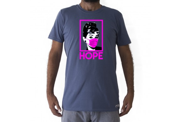 AUDREY HOPE es una camiseta original que con la estética del cartel que Shepard Fairey, alias OBEY, le dedicó a BARACK OBAMA bajo el lema de HOPE reutiliza LUIS RIVERA LINARES, diseñador de esta camiseta original que produce la GAMBA TARONJA. Esta vez quien motiva la esperanza es AUDREY HEPBURN con una mascarilla para dar un mensaje de esperanza.