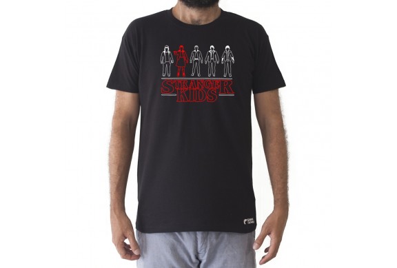 Stranger Kids es un diseño que reivindica el protagonismo de los niños de la popular serie STRANGER THINGS: Will, Lucas, Mike, Dustin, y como no ELEVEN. Es una camiseta original producida por la GAMBA TARONJA.