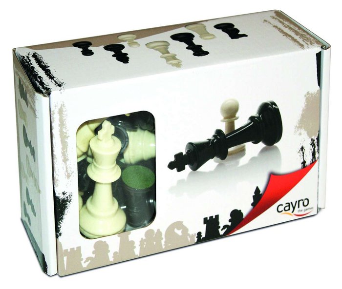 Accesorios de ajedrez en caja de cartón.