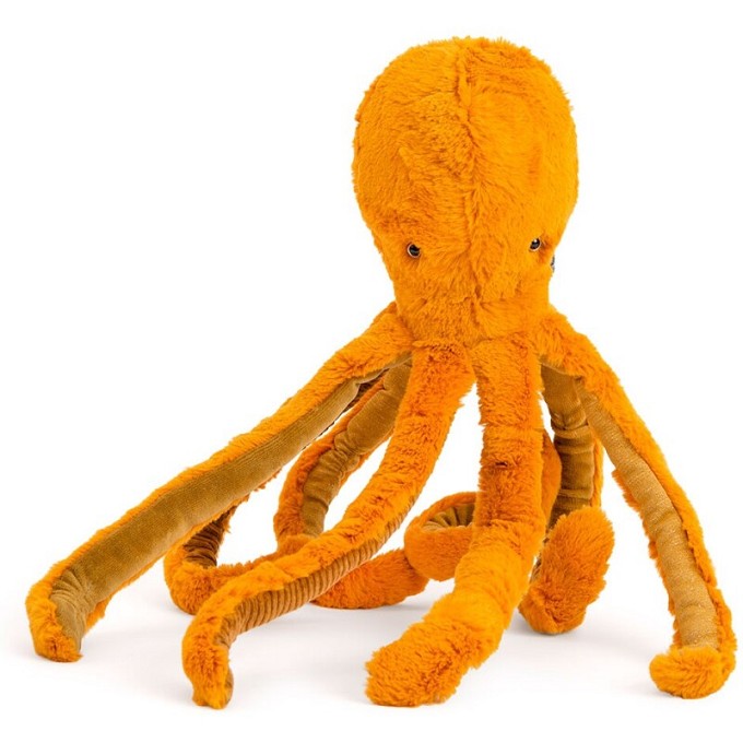 Una bonito y gran pulpo que se convertirá en la compañero inseparable de los peques. Está hecho de algodón y poliéster. Lo podrán abrazar y apretar gracias a su tacto y al ser muy blando. Perfecto para acompañarlos en la cama, coche, cochecito... Se puede lavar en la lavadora 30º y ciclo delicado.