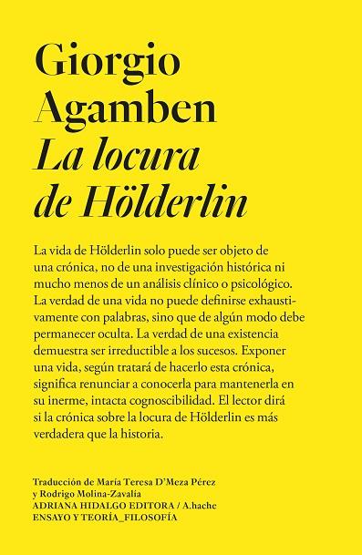 La vida de Hölderlin solo puede ser objeto de una crónica, no de una investigación histórica ni mucho menos de un análisis clínico o psicológico. La verdad de una vida no puede definirse exhaustivamente con palabras, sino que de algún modo debe permanecer oculta. La verdad de una existencia demuestra ser irreductible a los sucesos y a las cosas que se presentan ante nuestros ojos. Exponer una vida según tratará de hacerlo esta crónica significa renunciar a conocerla para mantenerla en su inerme, intacta cognoscibilidad. El lector dirá si la crónica sobre la locura de Hölderlin es más verdadera que la historia.