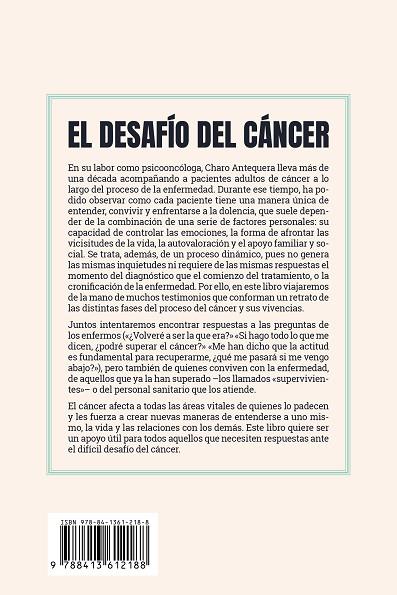 En su labor como psicooncóloga, Charo Antequera lleva más de una década acompañando a pacientes adultos de cáncer a lo largo del proceso de la enfermedad. Durante ese tiempo, ha podido observar como cada paciente tiene una manera única de entender, convivir y enfrentarse a la dolencia, que suele depender de la combinación de una serie de factores personales: su capacidad de controlar las emociones, la forma de afrontar las vicisitudes de la vida, la autovaloración y el apoyo familiar y social. Se trata, además, de un proceso dinámico, pues no genera las mismas inquietudes ni requiere de las mismas respuestas el momento del diagnóstico que el comienzo del tratamiento, o la cronificación de la enfermedad. Por ello, en este libro viajaremos de la mano de muchos testimonios que conforman un retrato de las distintas fases del proceso del cáncer y sus vivencias.