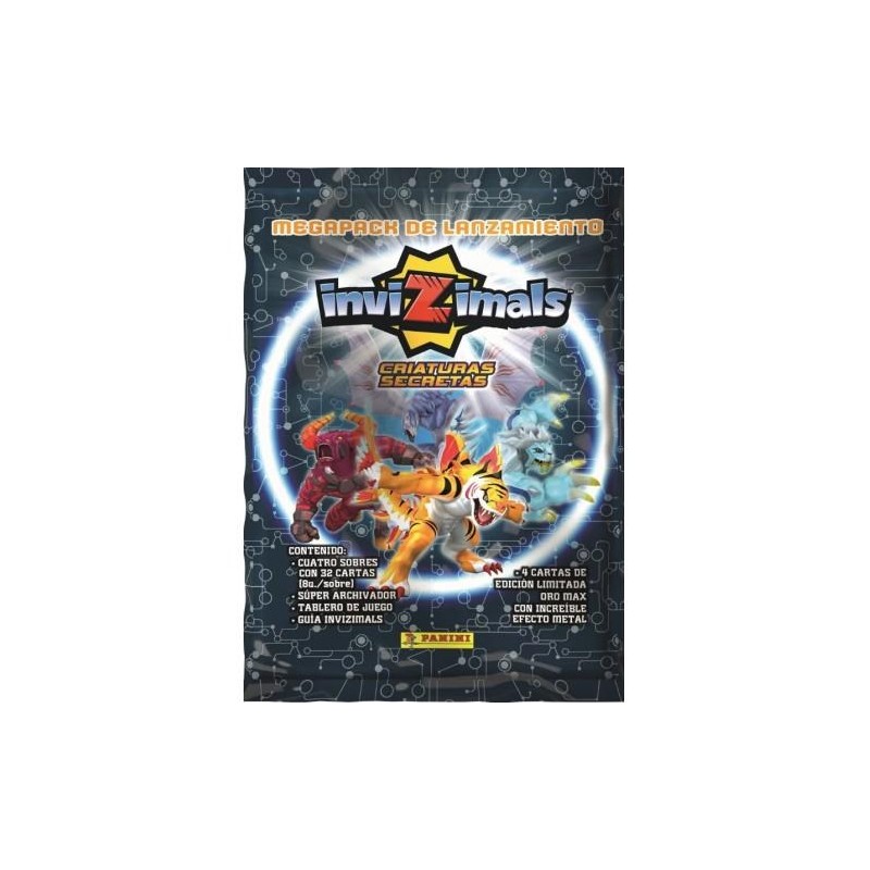 El Megapack de Lanzamiento de la magnífica colección de Trading Cards INVIZIMALS – Criaturas Secretas te permite obtener en exclusiva el Archivador de la colección, el Tablero de Juego, la Guía Oficial, 4 sobres con 32 cards y 4 cartas Edición Limitada Oro Max con increíble efecto metal.