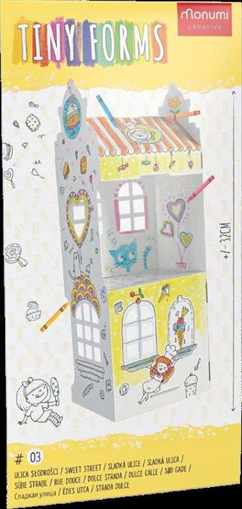 Un dulce mundo de delicias. Piruletas en maceta en lugar de plantas verdes, las cortinas de las ventanas fueron reemplazadas por guirnaldas de dulces de colores, frambuesas frescas y fresas fueron incrustadas en la alfombra de chocolate, y las paredes fueron decoradas con crema batida y algodón de azúcar. Estos manjares solo están disponibles en la calle Pyszno"¾ci 9. …¿Te gustaría un poco de dulzura? Esta casa inusual está cubierta con coberturas de glaseado, chocolate y frutas dulces. Tú le das sabores y colores.…Una espaciosa casa para colorear hecha de cartón blanco resistente. Elementos grandes, cortados con precisión, fáciles de montar sin pegamento ni tijeras. Instrucciones pictóricas en la parte posterior del paquete. Las piezas móviles, las ventanas, los espacios abiertos y los estantes hacen que el juguete sea más atractivo.