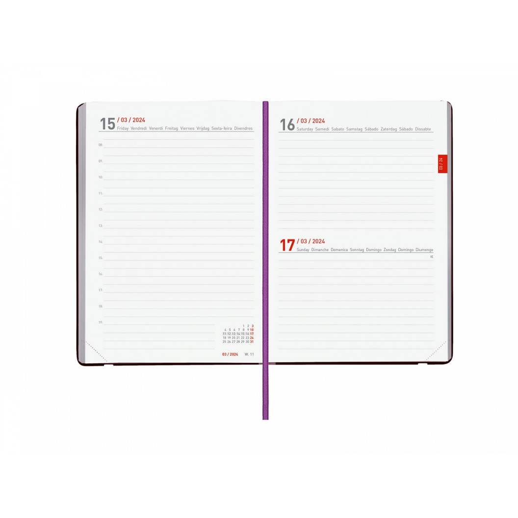 Agenda encuadernada de tapa flexible de 18 meses: inicio en julio de 2023 y finalización en diciembre de 2024. Perfecta para planificar a largo plazo. Cubiertas flexibles muy agradables al tacto y apertura perfecta para poder escribir cómodamente. Con cinta punto y goma elástica. Las esquinas son microperforadas para localizar rápidamente la semana en curso. Para facilitar la localización de cada mes, la anualidad ofrece un indicador en el lateral derecho de las páginas. Agenda con información de interés en la anualidad y otros contenidos extra.