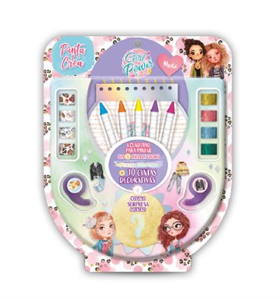 Este blíster contiene un cuaderno con las ilustraciones más bonitas de las chicas Girl Power para pintar, 5 ceras de colores, 8 cintas de washi tape variadas, dos dispensadores ¡y un producto sorpresa!