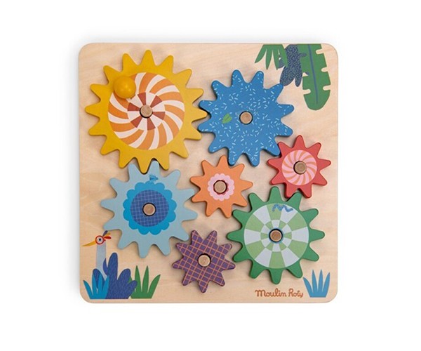 Juego de montaje, manipulación y experimentación.Al colocar todas las piezas del engranaje y hacer girar la rueda, produce un efecto en el resto de piezas que también giran a la vez.Edad recomendada: +2 años
