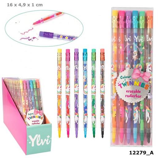 6 lápices, ¡12 colores! Cada uno de esstos lápices mecánicos de Ylvi rematados con una goma de borrar en la parte superior dibuja en dos colores: amarillo/naranja, rosa/rojo, lila/lavanda, turquesa/azul, verde/verde claro y marrón/negro. Solo hay que extraer la mina que se desee cambiar por la parte de abajo y volverla a introducir por arriba para que empuje a la nueva. Y lo mejor ¡es que son fácilmente borrables!
