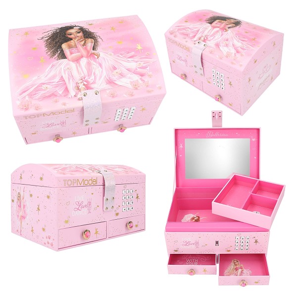 Para guardar verdaderos tesoros y pequeños secretos. Este joyero de TOPModel de color fucsia intenso es un auténtico sueño para las amantes del ballet: preciosas modelos con ropa de danza, cisnes gráciles, corazoncitos y pequeñas bailarinas. El joyero solo se deja abrir al introducir correctamente el código secreto personalizable. Mientras se abre suena durante 20 segundos aprox. la conocida canción "Symphonie". El joyero está provisto de un espejo en el interior de la tapa abatible y lleva incorporada una bandeja extraíble con tres compartimentos, además de dos cajones que ofrecen mucho espacio.