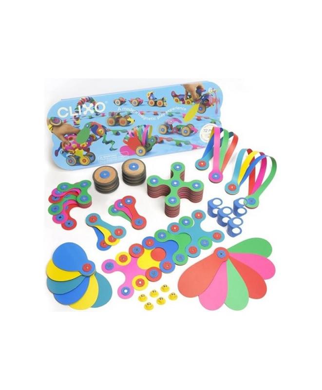 Este pack tiene 72 piezas en 10 formas únicas de CLIXO, incluidas ruedas y soportes. Las ruedas permiten llevar la experiencia de construcción al movimiento y la velocidad. Ya sea que haga clic en las ruedas de un automóvil o de un tren, de un pavo real rodante o de un elefante veloz, este pack lleva a los niños a descubrimientos creativos en movimiento.
