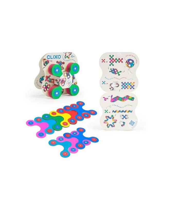 9 piezas de la característica forma Quad de CLIXO para realizar más de 100 ocurrentes creaciones. Ya sea una serpiente, una corona, una bola o formas apilables. ¡Con este maravilloso kit de bolsillo encontrarás un mundo de formas y descubrimientos muy divertidos!