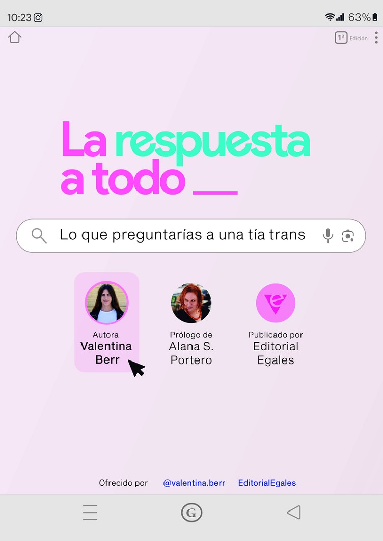 «En tiempos de imposición de silencios y repetición de eslóganes, Valentina recupera con humor, cercanía y la más subversiva de las astucias la radicalidad del verbo preguntar. Te hará creer que responde a tus preguntas cuando, realmente, llena de interrogantes tu cotidianidad. Sin duda saciarás tu curiosidad, mas no podrás abandonar esta conversación sin sufrir tu propia trans/formación».IRA HYBRIS, autora de Mutantes y divinas