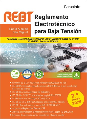 Esta nueva edición del REBT que aquí presentamos está totalmente corregida y actualizada según: -- Resolución 20/3/2025, por la que se actualiza el listado de normas de la ITC-BT-02.-- RD 298/2021, por el que se amplía el campo de aplicación del REBT, que afectará ahora también a cualquier modificación o reparación de las instalaciones; además, se añaden cambios relativos a la competencia de las empresas instaladoras, y a los requisitos para la acreditación del Instalador en Baja Tensión, así como a los conocimientos mínimos para su desempeño.-- RD 542/2020, por el que se renuevan las especificaciones particulares de las empresas distribuidoras; se dan nuevas directrices sobre la documentación y puesta en servicio de las instalaciones; y se especifican los nuevos criterios para la preinstalación en edificios de puntos de recarga para el vehículo eléctrico.-- RD 244/2019, en el que se modifica la ITC-BT-40 en relación al autoconsumo de energía eléctrica.-- RD 1053/2014, que añade la ITC-BT-52 en relación a la recarga del vehículo eléctrico.-- Reglamento Europeo CPR (posible reacción al fuego de los cables eléctricos).-- Artículo 25 actualizado al reconocimiento mutuo según RD 145/2023. Actualización de normas UNE -- ITC-BT-06 e ITC-BT-07, actualizadas a las nuevas tablas para el cálculo de la sección de conductores en líneas eléctricas aéreas y subterráneas según norma UNE 20435 (que anula y sustituye a la antigua UNE 211435).-- ITC-BT-19 actualizada a la norma UNE-HD 60364-5-52 en relación a las intensidades máximas admisibles sobre conductores en instalaciones de interior.-- Anotaciones en el texto de este REBT de aquellas normas que han sido anuladas y referencia a las nuevas normas vigentes por las que han sido sustituidas Resumen de la Guía Técnica de Aplicación del REBT En las instrucciones técnicas complementarias de este texto se han añadido notas aclaratorias extraídas de la Guía Técnica, que serán de gran ayuda para interpretar los aspectos más complejos de este REBT. Notas, ejemplos de cálculo, figuras en color y resúmenes Con el fin de aclarar algunos conceptos que aparecen en el REBT y ayudar a su comprensión, se han incluido ejemplos de cálculo, notas con explicaciones sencillas, resúmenes y figuras en color. Material web Además se ofrecen al lector multitud de recursos didácticos como Material web, que le serán de valiosa ayuda para comprender los conceptos relativos al REBT y profundizar en ellos. Aquí se podrán encontrar, todos los Reales Decretos que afectan al REBT, la Guía Técnica completa y actualizada, diferentes normativas y multitud de documentos técnicos de utilidad. El usuario podrá acceder a este Material web mediante un sencillo registro desde la sección de «Recursos previo registro» en la página web de la obra (disponible en www.paraninfo.es).