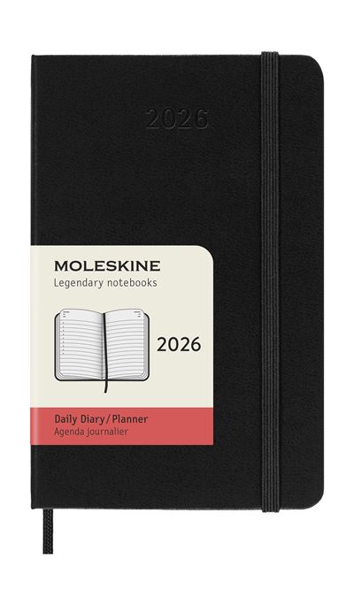 Agenda pocket 2026 día página tapa dura Moleskine en color negro. Una página por día de enero a diciembre 2026. Cierre con goma y cinta marcadora. Contiene herramientas útiles: calendario, planificación de viajes,ideas y objetivos, páginas a rayas para notas. Año grabado en la cubierta delantera. 40...