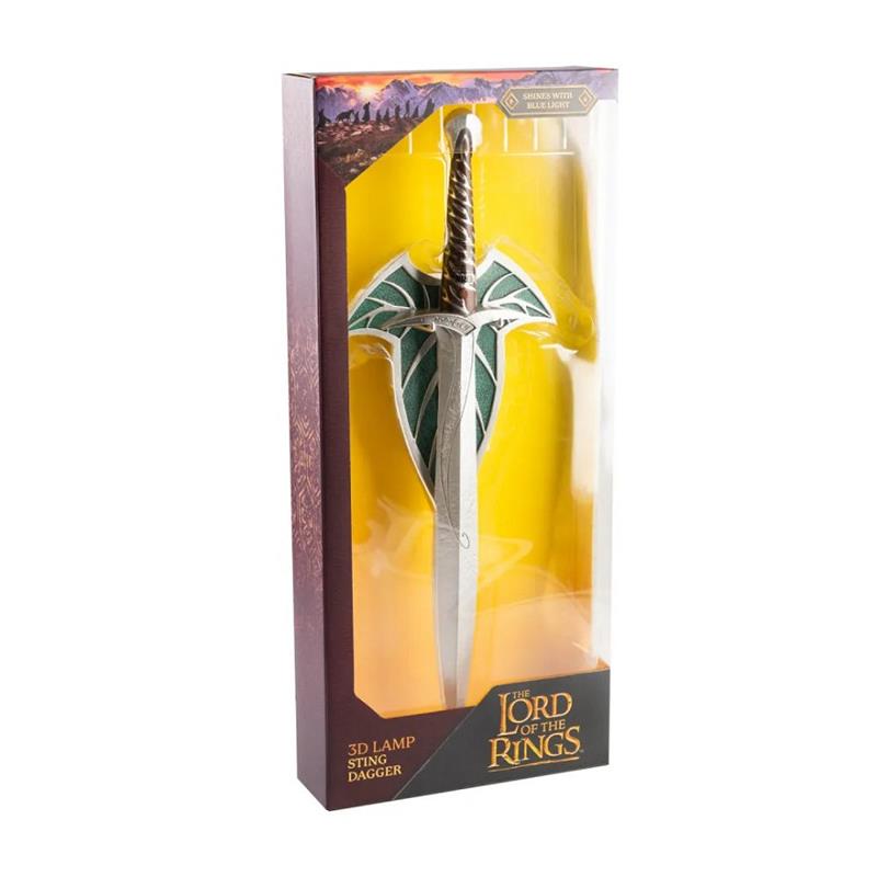 Lámpara fabricada en ABS. Incluye un modo de iluminación LED de color azul, controlado por un botón en el mango de la daga. Funciona con cable USB tipo C 5V DC 1A (incluido y extraíble) y batería interna recargable de Li-ion 800 mAh 3,7V, con hasta 4 horas de autonomía y carga máxima en 3 horas y 30 minutos. Incluye soporte para colgar la daga, con dos orificios traseros para facilitar su instalación en la pared, además de tacos y tornillos. Medidas de la daga: 51 x 12,5 x 3,3 cm. Medidas del soporte: 24,5 x 18,5 x 4,6 cm.