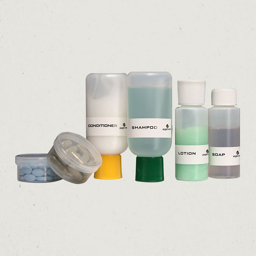 Amb dos ampolles per al seu xampú i condicionador, dos ampolles per als seus altres líquids o gels, i 2 caixes de pastilles per als seus medicaments o vitamines.
