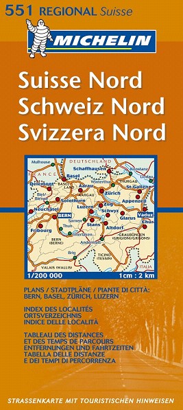 La edición actualizada del mapa Regional Suisse Nord, editado a escala 1/200 000, incorpora un índice de localidades, cuadro de distancias y tiempos de recorrido entre ciudades, así como los planos de Berna, Basilea, Zúrich y Lucerna.